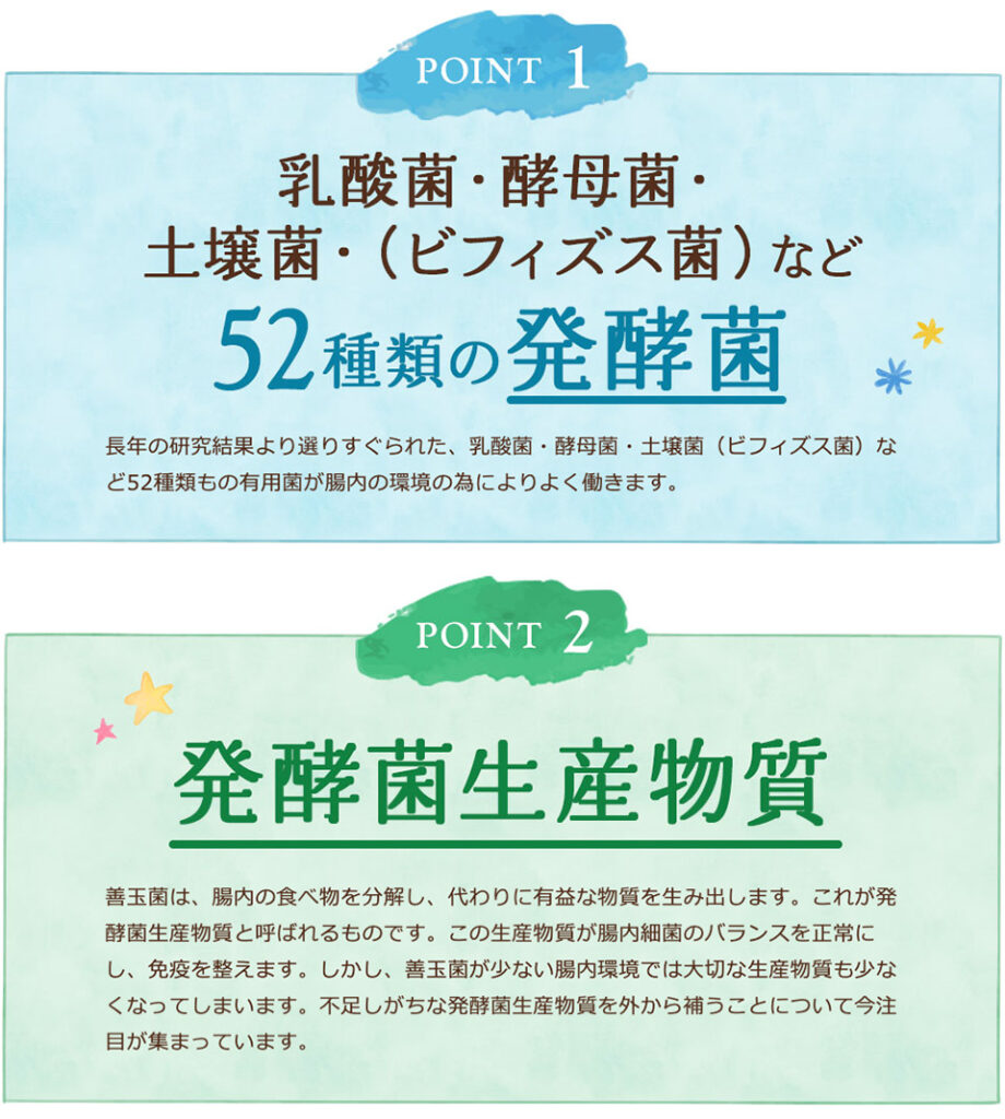 普通の酵素ドリンクは数種類の菌でしか発酵させるケースが多いらしいけど、これは乳酸菌とか全部で52種類の菌で爆発的に発酵させてるらしい。